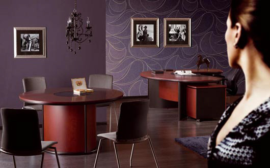 Intr-o camera de birouri puteti opta pentru un birou oval pe semirotun si o masuta rotunda pentru cafea sau discutii. Corpurile sunt create din PAL melaminat de 18 mm grosime, cu cant ABS de 2 mm grosime. Sistemul de prindere mascat este de la Hafele Germania. Puteti beneficia si de proiectare 3D a unui mobilier dorit de dumneavoastra. Mobilierul se poate fabrica si pe alte nuante, forme sau texturi.